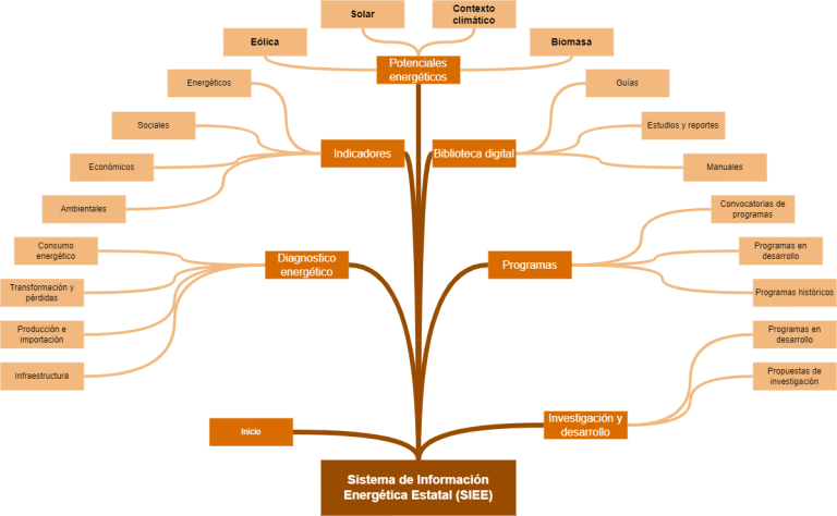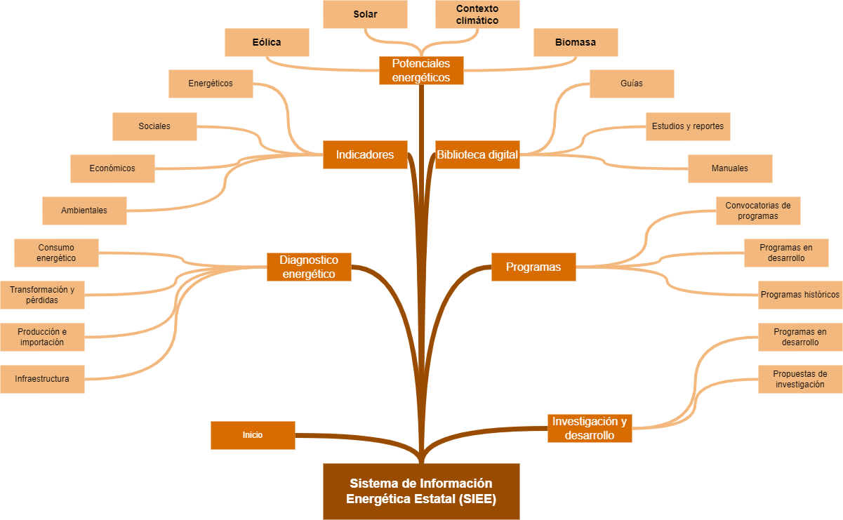 El SIEE integra los siguientes módulos: Diagnóstico energético, potenciales energéticos, biblioteca digital, programas estatales del sector e investigación; poniendo a disposición de todos los usuarios, información útil para cada tipo de perfil del sector energético, con periodicidades diferidas, dependiendo la información que se requiera consultar y organizada de la siguiente manera: